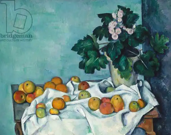 Cézanne namaloval obraz Still Life with Apples and a Pot of Primroses v roce 1890. Převládající barvy tohoto obrazu jsou do zelena a jeho formát je na šířku. Rozměr originálu je 73x92.4. Umístěním originálu obrazu je Metropolitan Museum of Art, New York, USA. Reprodukci tohoto obrazu tiskneme na přání - můžete si zvolit rozměr i provedení reprodukce.