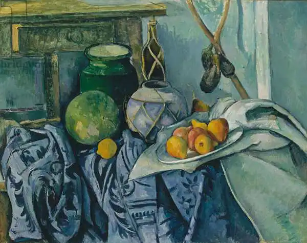 Cézanne namaloval obraz Still Life with Ginger Jar and Aubergine v roce 1890. Převládající barvy tohoto obrazu jsou do zelena a jeho formát je na šířku. Rozměr originálu je 72.4x91.4. Umístěním originálu obrazu je Metropolitan Museum of Art, New York, USA. Reprodukci tohoto obrazu tiskneme na přání - můžete si zvolit rozměr i provedení reprodukce.