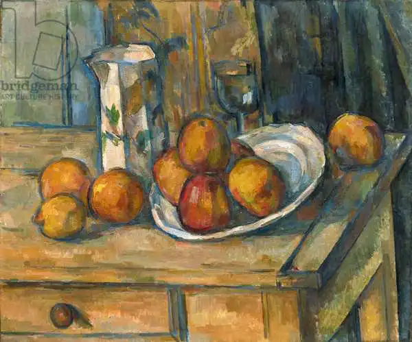 Cézanne namaloval obraz Still Life with Milk Jug and Fruit v roce 1900. Převládající barvy tohoto obrazu jsou do zelena a jeho formát je na šířku. Rozměr originálu je 45.8x54.9. Umístěním originálu obrazu je National Gallery of Art, Washington DC, USA. Reprodukci tohoto obrazu tiskneme na přání - můžete si zvolit rozměr i provedení reprodukce.
