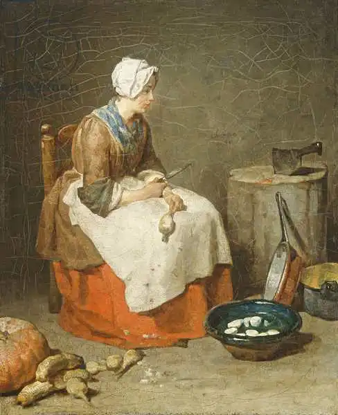 Chardin namaloval obraz Kitchen Maid v roce 1738. Převládající barvy tohoto obrazu jsou do zelena a jeho formát je na výšku. Rozměr originálu je 46.2x37.5. Umístěním originálu obrazu je National Gallery of Art, Washington DC, USA. Reprodukci tohoto obrazu tiskneme na přání - můžete si zvolit rozměr i provedení reprodukce.