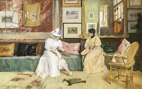 Chase namaloval obraz Friendly Call v roce 1895. Převládající barvy tohoto obrazu jsou do zelena a jeho formát je podlouhlý. Rozměr originálu je 76.5 x 122.5 cm. Umístěním originálu obrazu je National Gallery of Art, Washington DC, USA. Reprodukci tohoto obrazu tiskneme na přání - můžete si zvolit rozměr i provedení reprodukce.
