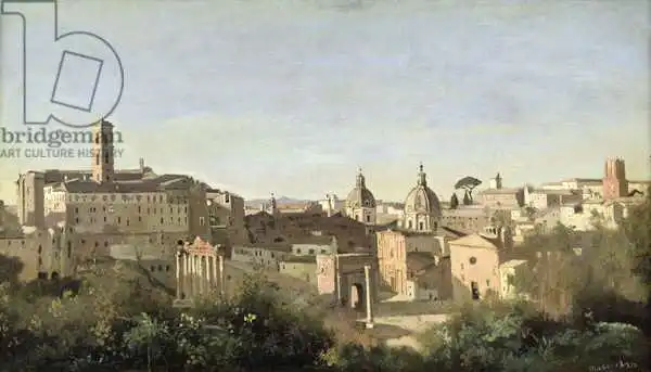 Corot namaloval obraz Forum seen from the Farnese Gardens, Rome v roce 1826. Převládající barvy tohoto obrazu jsou do zelena a jeho formát je podlouhlý. Rozměr originálu je 28x50. Umístěním originálu obrazu je Louvre, Paris, France. Reprodukci tohoto obrazu tiskneme na přání - můžete si zvolit rozměr i provedení reprodukce.