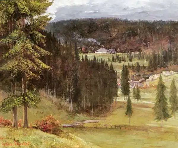 Courbet namaloval obraz La Ferme des Pussets v roce 1864. Převládající barvy tohoto obrazu jsou do hněda a jeho formát je na šířku. Rozměr originálu je 54x65. Obraz je umístěn v soukromé sbírce. Reprodukci tohoto obrazu tiskneme na přání - můžete si zvolit rozměr i provedení reprodukce.