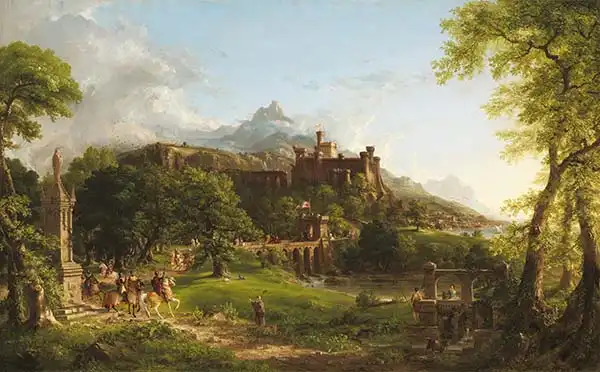 Thomas Cole (1801-1848) byl americký krajinář z období romantismu. Narodil se v Anglii, ale v 17 letech jeho rodina emigrovala do USA. Jeho otec prodával tapety. Cole cestoval po Ohiu a maloval hlavně portréty, kterými si vydělával. Na cestě do New Yorku si vyrazil na výlet po řece Hudson. Vytvořil řadu skic okolních hor a přírody, které později přenesl do obrazů Indian Pass nebo třeba Pohled na dvě jezera. Tyto obrazy se rychle prodaly a Coleovi se začaly hrnout zakázky a mohl tak vycestovat za uměním do Evropy. Procestoval Itálii, zejména okolí Říma a Sicílii. Po návratu pokračoval v krajinomalbě a začal dělat i alegorické práce - Sen Arcadie. Nejznámější je pětidílná série obrazu mapující změnu přírody. Těsně před svou smrtí se ještě jednou vydal do Evropy. Velká část jeho prací je uložena v Detroitském museu.