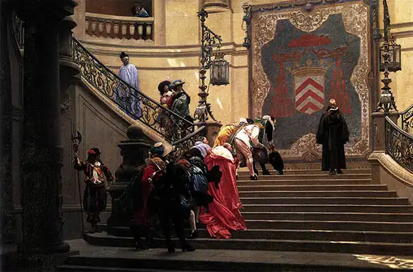 Na obraze je vidět skupinu lidí oblečených v historických kostýmech, kteří stoupají po schodišti v honosné budově. Muži a ženy mají na sobě šaty zdobené a často barevné, typické pro období přelomu 18. a 19. století. Na schodišti je vyšší hustota lidí, někteří muži nosí cylindry. V pozadí je zdobná stěna s erbem a kovovou balustrádou. Okolí působí vznešeně a architektonicky bohatě zdobeně.