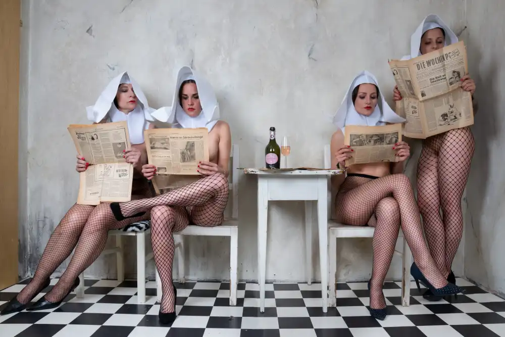 #jeptíška #jeptičky #klobouky #novinky #noviny #papíry #nápoj #nápoje #víno #láhev vína #sklo #sklenečka #síť #židle #sedení #sedění #dáma #vintage #retro #výtvarné umění nahý #nahý #dívka #modelka #modelky #dívky #žena #ženy #nahy #erotika #sexy #čtění #čtení #jídlo a nápoje #bar #alkohol #láhev #láhve #kokovaný #nostalgie #smyslnostní #figurativní #portrét #člověk #lidé