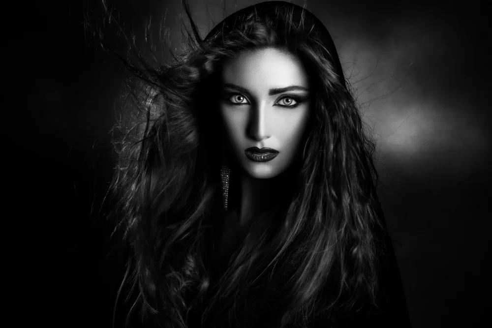 #žena #modelka #dívka #oblíč #oči #portrét #nálada #krása #studiový portrét #monochromní #čb #móda #člověk #lidé #tmavý #low key #low-key #figurativní #vlasy #černá a bílý