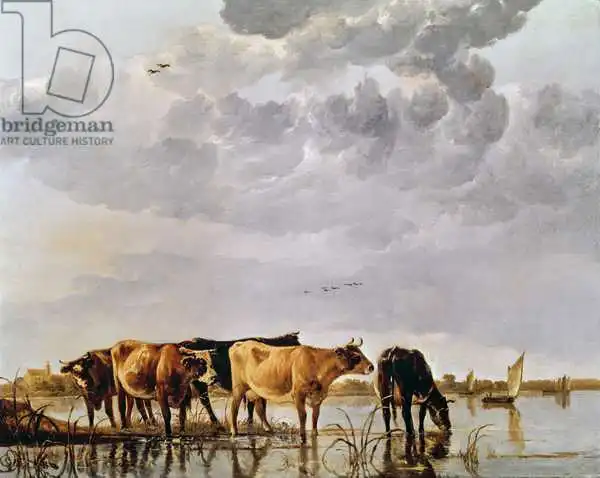 Nejslavnější z rodiny malířů, žák svého otce, Aelbert Jacobs Cuyp (1620-1691) byl holandský krajinář zlatého věku 17. století. Často je přirovnáván ke Claude Lorrainovi. O Cuypově životě se nedochovalo mnoho informací. Z toho co víme, je zřejmé, že se stal jáhnem rok po té, co se oženil s Cornelii Bosmanovou. Více toho ale víme o jeho celoživotní malířské práci. Nejvíce aktivní a na vrcholu své kariéry byl v letech 1630 - 1650. Jeho malířský styl ovlivnil Jan Josephszoon van Goyena, žlutými a světlehnědými tóny, patrnými na obraze Krajina s dobytkem, nebo Maas at Dordrecht a jeho otec, kterému jakožto portrétistovi pořizoval krajinná pozadí pro jeho obrazy. Cyup své obrazy pochopitelně podepisoval ale bohužel jen jménem. Nelze tedy přesně určit, kdy byla vytvořena.