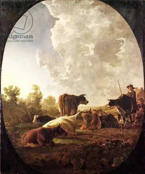 Nejslavnější z rodiny malířů, žák svého otce, Aelbert Jacobs Cuyp (1620-1691) byl holandský krajinář zlatého věku 17. století. Často je přirovnáván ke Claude Lorrainovi. O Cuypově životě se nedochovalo mnoho informací. Z toho co víme, je zřejmé, že se stal jáhnem rok po té, co se oženil s Cornelii Bosmanovou. Více toho ale víme o jeho celoživotní malířské práci. Nejvíce aktivní a na vrcholu své kariéry byl v letech 1630 - 1650. Jeho malířský styl ovlivnil Jan Josephszoon van Goyena, žlutými a světlehnědými tóny, patrnými na obraze Krajina s dobytkem, nebo Maas at Dordrecht a jeho otec, kterému jakožto portrétistovi pořizoval krajinná pozadí pro jeho obrazy. Cyup své obrazy pochopitelně podepisoval ale bohužel jen jménem. Nelze tedy přesně určit, kdy byla vytvořena.