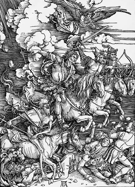 Čtyři jezdci apokalypsy jsou nám známí z biblického textu Zjevení Jana, který je součástí Nového zákona. Albrecht Dürer, slavný německý renesanční umělec, vytvořil sérii dřevořezů na toto téma kolem roku 1497-1498. Jedná se o jednu z jeho nejznámějších prací a je známá svým detailním zpracováním a expresivním vyjádřením tématu apokalypsy. V tomto díle Dürer zobrazil čtyři jezdce na koních, kteří představují čtyři různé apokalyptické jevy. Každý jezdec je spojen s jedním z čtyř jízd apokalypsy, jak jsou popsány v knize Zjevení: