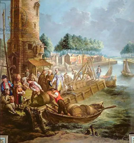 Garemyn, Jan-Anton: Canal scene with wine merchant unloading barrels