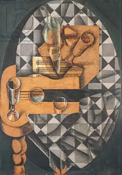 Gris namaloval obraz Guitar, Bottle, and Glass v roce 1914. Převládající barvy tohoto obrazu jsou do zelena a jeho formát je na výšku. Rozměr originálu je 91.8x64.8. Umístěním originálu obrazu je Museum of Modern Art, New York, USA. Reprodukci tohoto obrazu tiskneme na přání - můžete si zvolit rozměr i provedení reprodukce.