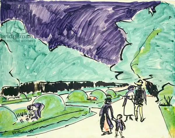 35x45 Kirchner namaloval obraz Entrance to a large garden in Dresden v roce 1905. Převládající barvy tohoto obrazu jsou do zelena a jeho formát je na šířku. Rozměr originálu je 35x45. Umístěním originálu obrazu je Hamburger Kunsthalle, Hamburg, Germany. Reprodukci tohoto obrazu tiskneme na přání - můžete si zvolit rozměr i provedení reprodukce.