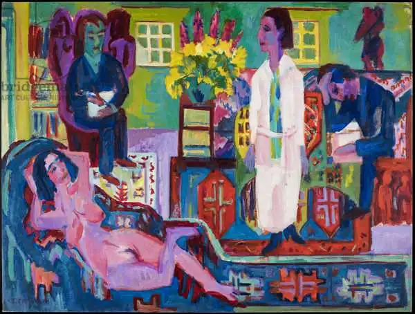 Ernst Ludwig Kirchner (1880-1938) byl německý expresinistický malíř, který se svými spolužáky založil umělecké sdružení Die Brücke. Kirchner vystudoval architekturu v Drážďanech a malířství v Mnichově. Jeho tvorba byla silně ovlivněna Edwardem Munchem. Ve svých obrazech zachycoval syrové lidské emoce a pro svůj postoj byl brán za vyhnance. Pro své obrazy používal jako modely především prostitutky, které zachytil na různých akctech, např. obraz Akt v interiéru nebo Tři ženy při koupeli. Během války byl propuštěn ze služby, neboť se duševně zhroutil. Při jeho pobytu v sanatoriích ve Frankfurtu a v Davosu, se jeho duše zklidnila; vypěstoval si však závislost na lécích na spaní, morfiu a alkoholu. Když už se téměř zotavil, fašisté s nástupem své moci, zabavili na šest set obrazů a jeho prohlásili zvráceným umělcem. Nesměl vystavovat, což pro něj byl konec. Zničil mnoho svých dřevorytů a děl a 15.6.1938 se zastřelil ve Frankfurtu před svým domem. Jeho obrazy jsou dnes velmi ceněné a k vidění např. v Museum of Modern Art v New Yorku.