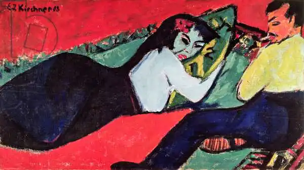 Ernst Ludwig Kirchner (1880-1938) byl německý expresinistický malíř, který se svými spolužáky založil umělecké sdružení Die Brücke. Kirchner vystudoval architekturu v Drážďanech a malířství v Mnichově. Jeho tvorba byla silně ovlivněna Edwardem Munchem. Ve svých obrazech zachycoval syrové lidské emoce a pro svůj postoj byl brán za vyhnance. Pro své obrazy používal jako modely především prostitutky, které zachytil na různých akctech, např. obraz Akt v interiéru nebo Tři ženy při koupeli. Během války byl propuštěn ze služby, neboť se duševně zhroutil. Při jeho pobytu v sanatoriích ve Frankfurtu a v Davosu, se jeho duše zklidnila; vypěstoval si však závislost na lécích na spaní, morfiu a alkoholu. Když už se téměř zotavil, fašisté s nástupem své moci, zabavili na šest set obrazů a jeho prohlásili zvráceným umělcem. Nesměl vystavovat, což pro něj byl konec. Zničil mnoho svých dřevorytů a děl a 15.6.1938 se zastřelil ve Frankfurtu před svým domem. Jeho obrazy jsou dnes velmi ceněné a k vidění např. v Museum of Modern Art v New Yorku.
