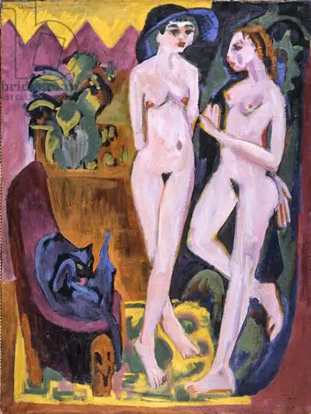 120.3325x93.345 Kirchner namaloval obraz Two Nudes in a Room v roce 1914. Převládající barvy tohoto obrazu jsou do hněda a jeho formát je na výšku. Rozměr originálu je 120.3325x93.345. Umístěním originálu obrazu je Los Angeles County Museum of Art, CA, USA. Reprodukci tohoto obrazu tiskneme na přání - můžete si zvolit rozměr i provedení reprodukce.
