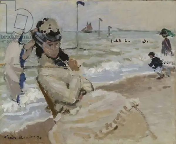 Monet namaloval obraz Camille on the Beach in Trouville v roce 1870. Převládající barvy tohoto obrazu jsou do zelena a jeho formát je na šířku. Rozměr originálu je 38.1x46.4. Umístěním originálu obrazu je Yale University Art Gallery, New Haven, CT, USA. Reprodukci tohoto obrazu tiskneme na přání - můžete si zvolit rozměr i provedení reprodukce.