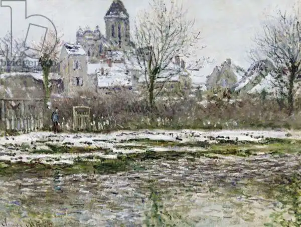 Monet namaloval obraz Church at Vetheuil under Snow v roce 1878-79. Převládající barvy tohoto obrazu jsou do zelena a jeho formát je na šířku. Rozměr originálu je 52x71. Umístěním originálu obrazu je Musee dOrsay, Paris, France. Reprodukci tohoto obrazu tiskneme na přání - můžete si zvolit rozměr i provedení reprodukce.
