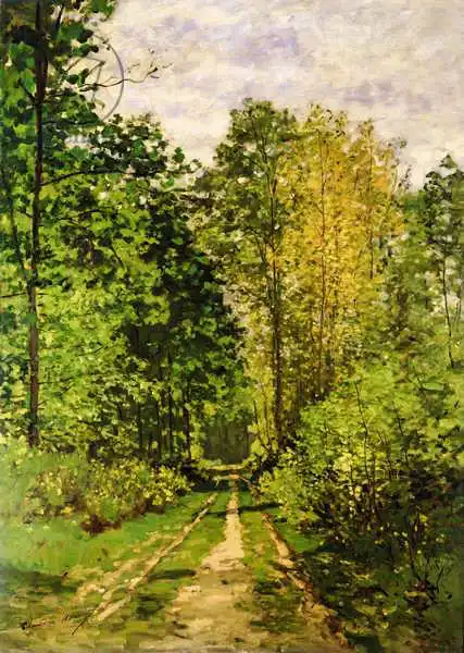 Monet namaloval obraz Wooded Path v roce 1865. Převládající barvy tohoto obrazu jsou do zelena a jeho formát je na výšku. Rozměr originálu je 80.6x59. Obraz je umístěn v soukromé sbírce. Reprodukci tohoto obrazu tiskneme na přání - můžete si zvolit rozměr i provedení reprodukce.