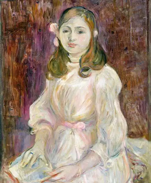 Morisot namaloval obraz Portrait of Julie Manet (1878-1966) Holding a Book v roce 1889. Převládající barvy tohoto obrazu jsou do hněda a jeho formát je na výšku. Rozměr originálu je 65x54. Obraz je umístěn v soukromé sbírce. Reprodukci tohoto obrazu tiskneme na přání - můžete si zvolit rozměr i provedení reprodukce.
