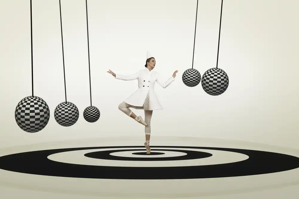 #kreativní editace #míč #koule #dáma #karovaný #cíl #kroužky #prsten #balet #balerina #póza #tanec #tanečnice #fyzika #věda #energie #koncepční #rovnováha #gravita #pohyb #žena #výkon