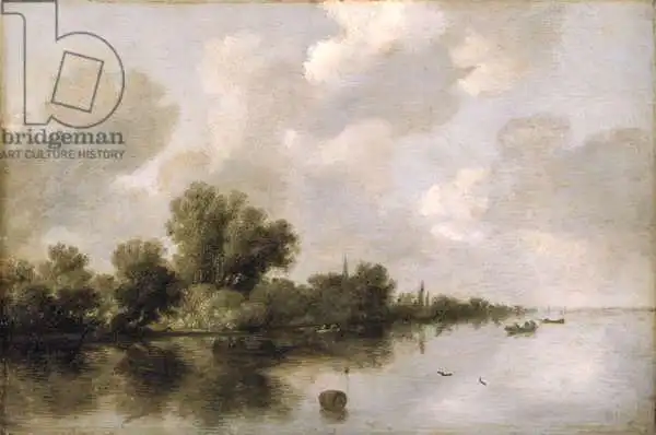 Ruisdael namaloval obraz Krajina s řekou v roce 1632. Převládající barvy tohoto obrazu jsou do zelena a jeho formát je na šířku. Rozměr originálu je 33.6x50.5. Umístěním originálu obrazu je Hamburger Kunsthalle, Hamburg, Germany. Reprodukci tohoto obrazu tiskneme na přání - můžete si zvolit rozměr i provedení reprodukce.