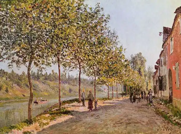 Alfred Sisley (1839 – 1899). Francouzský impresionistický krajinář malující v souladu s impresionistickou tradicí zásadně v plenéru. Mezi jeho známé obrazy patří série maleb z okolí Temže a francouzského města Moret-sur-Loing. Jako malíře jej v raném období ovlivnili Turner a Constable. Jeho práce mají společné rysy s malbami Pissarra, mají atmosféru a vystihují kouzlo místa. Sisley byl mistrem malování oblohy, které jsou na jeho obrazech vždy „impresivní“.