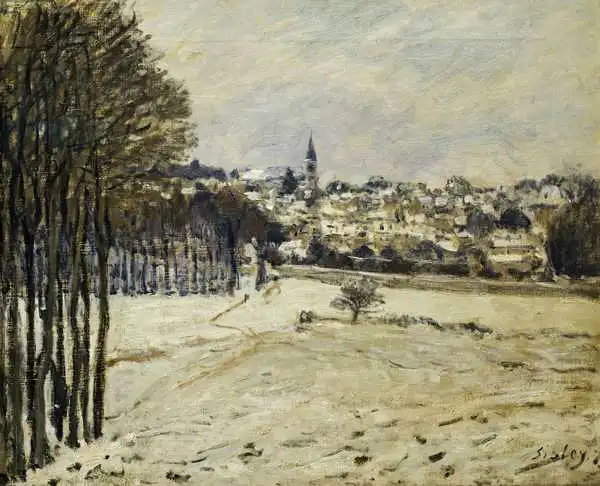 46.5x56 Sisley namaloval obraz Snow at Marly-le-Roi v roce 1875. Převládající barvy tohoto obrazu jsou do modra a jeho formát je na šířku. Rozměr originálu je 46.5x56. Umístěním originálu obrazu je Musee dOrsay, Paris, France. Reprodukci tohoto obrazu tiskneme na přání - můžete si zvolit rozměr i provedení reprodukce.