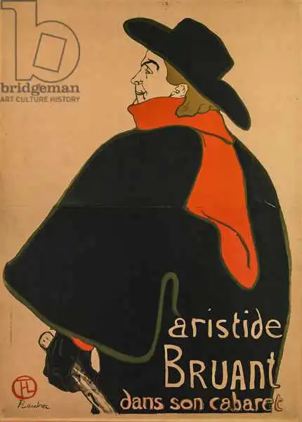 Toulouse-Lautrec namaloval obraz Aristide Bruant, at His Cabaret v roce 1893. Převládající barvy tohoto obrazu jsou do hněda a jeho formát je na výšku. Rozměr originálu je 138x99. Umístěním originálu obrazu je Metropolitan Museum of Art, New York, USA. Reprodukci tohoto obrazu tiskneme na přání - můžete si zvolit rozměr i provedení reprodukce.