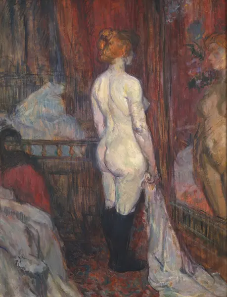 Toulouse-Lautrec namaloval obraz Woman before a Mirror v roce 1897. Převládající barvy tohoto obrazu jsou do zelena a jeho formát je na výšku. Rozměr originálu je 62.2x47. Umístěním originálu obrazu je Metropolitan Museum of Art, New York, USA. Reprodukci tohoto obrazu tiskneme na přání - můžete si zvolit rozměr i provedení reprodukce.