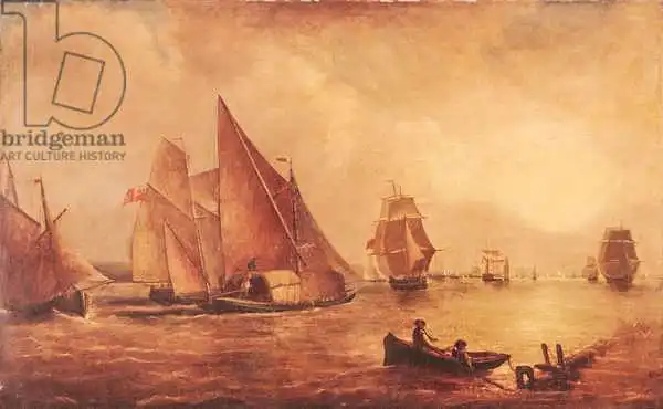 Fighting Temeraire (bitevní loď, která se proslavila v bitvě u Trafalgaru) z roku 1839, na němž proslulou loď táhne parník do doků k rozebrání.