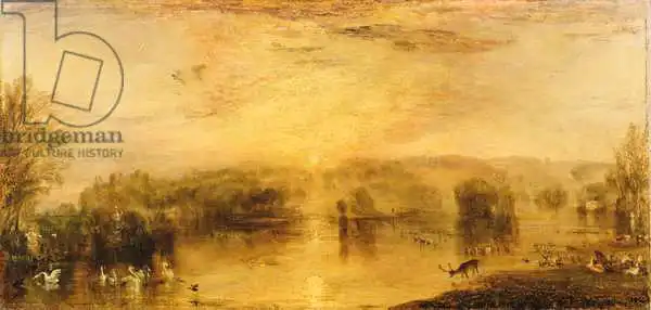 Turner namaloval obraz Lake, Petworth: Sunset, a Stag Drinking v roce 1829. Převládající barvy tohoto obrazu jsou do oranžova a jeho formát je podlouhlý. Rozměr originálu je 63.5x132.1. Umístěním originálu obrazu je Petworth House, Sussex, UK. Reprodukci tohoto obrazu tiskneme na přání - můžete si zvolit rozměr i provedení reprodukce.
