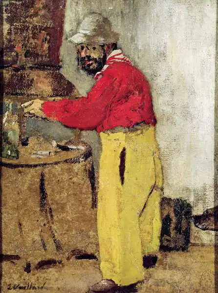 Jean-Edouard Vuillard (1868-1940) byl francouzský malíř klasického období. Vystudoval umění v pařížské Akademii. Společně s a dalšími umělci (Maurice Denis, Pierre Bonnard, Paul Serusier, Ker-Xavier Roussel a Félix Vallotton) byl členem skupiny Nabis, což hebrejsky znamená prorok. Jejich velkým vzorem a inspirací byl francouzský malíř Paul Gauguin. Protože Villard žil celý život se svou matkou, švadlenou, mnoho jeho děl nese tématiku domácích prací. Své obrazy, jako např. Dvě šičky při práci doplňoval o bohatě zdobené tapety a dámské šaty. Vuillard maloval nejen obrazy, ale také plakáty - La Patiserie. V roce 1899 skupina Nabis bohužel vystavovala naposledy. Vuillard pak maloval ve svém ateliéru portréty a zátiší pro bohatší klientelu. Pustil se také do zobrazovaní intimních scén, pro které mu pózovali jeho přátelé umělci