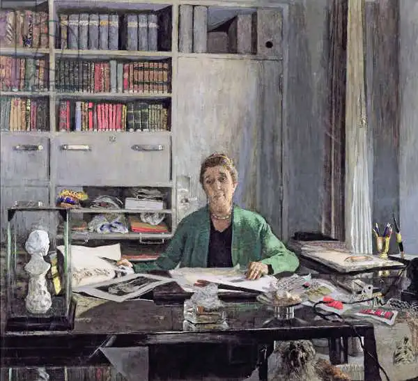 Jean-Edouard Vuillard (1868-1940) byl francouzský malíř klasického období. Vystudoval umění v pařížské Akademii. Společně s a dalšími umělci (Maurice Denis, Pierre Bonnard, Paul Serusier, Ker-Xavier Roussel a Félix Vallotton) byl členem skupiny Nabis, což hebrejsky znamená prorok. Jejich velkým vzorem a inspirací byl francouzský malíř Paul Gauguin. Protože Villard žil celý život se svou matkou, švadlenou, mnoho jeho děl nese tématiku domácích prací. Své obrazy, jako např. Dvě šičky při práci doplňoval o bohatě zdobené tapety a dámské šaty. Vuillard maloval nejen obrazy, ale také plakáty - La Patiserie. V roce 1899 skupina Nabis bohužel vystavovala naposledy. Vuillard pak maloval ve svém ateliéru portréty a zátiší pro bohatší klientelu. Pustil se také do zobrazovaní intimních scén, pro které mu pózovali jeho přátelé umělci