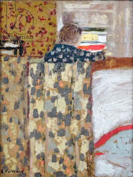 Jean-Edouard Vuillard (1868-1940) byl francouzský malíř klasického období. Vystudoval umění v pařížské Akademii. Společně s a dalšími umělci (Maurice Denis, Pierre Bonnard, Paul Serusier, Ker-Xavier Roussel a Félix Vallotton) byl členem skupiny Nabis, což hebrejsky znamená prorok. Jejich velkým vzorem a inspirací byl francouzský malíř Paul Gauguin. Protože Villard žil celý život se svou matkou, švadlenou, mnoho jeho děl nese tématiku domácích prací. Své obrazy, jako např. Dvě šičky při práci doplňoval o bohatě zdobené tapety a dámské šaty. Vuillard maloval nejen obrazy, ale také plakáty - La Patiserie. V roce 1899 skupina Nabis bohužel vystavovala naposledy. Vuillard pak maloval ve svém ateliéru portréty a zátiší pro bohatší klientelu. Pustil se také do zobrazovaní intimních scén, pro které mu pózovali jeho přátelé umělci
